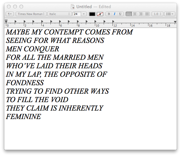 Sara Sutterlin was born in 1988. She currently resides in Montreal, QC. She curated and edited an anthology featuring 34 women poets & writers in 2014. It is available both in print and digitally (payhip.com/heroincookies) She also makes zines and chapbooks. You may find some of her published work in The Chapess zine (vol 4 & 5) + more.